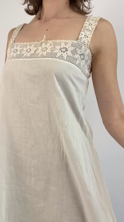 A piece that feels both playful and captivating, this delicate Edwardian cotton mini dress features a crocheted square neckline and flouncy bias-cut.