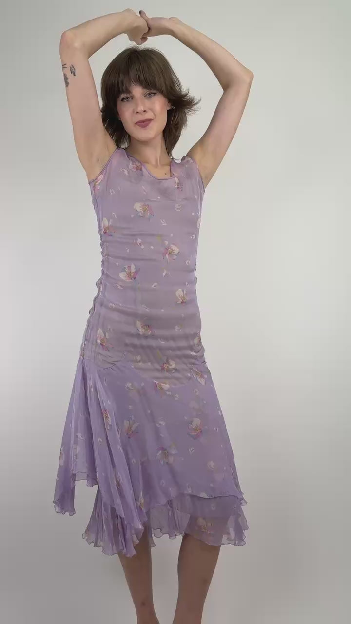 Pastel purple sleeveless dress with soft floral print throughout. Features a drop waist and a handkerchief tiered skirt. Effortlessly romantic and perfect for styling day or night.
