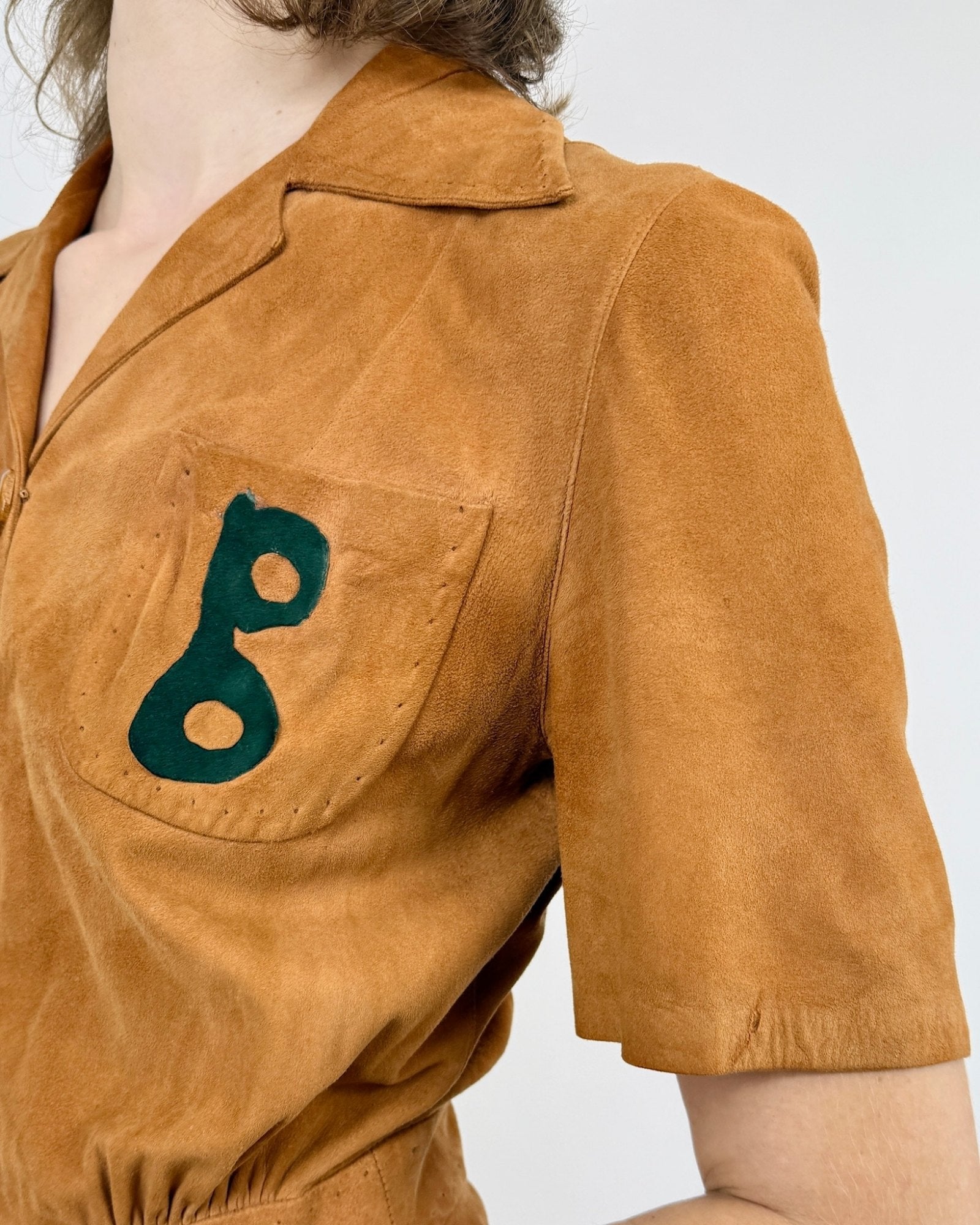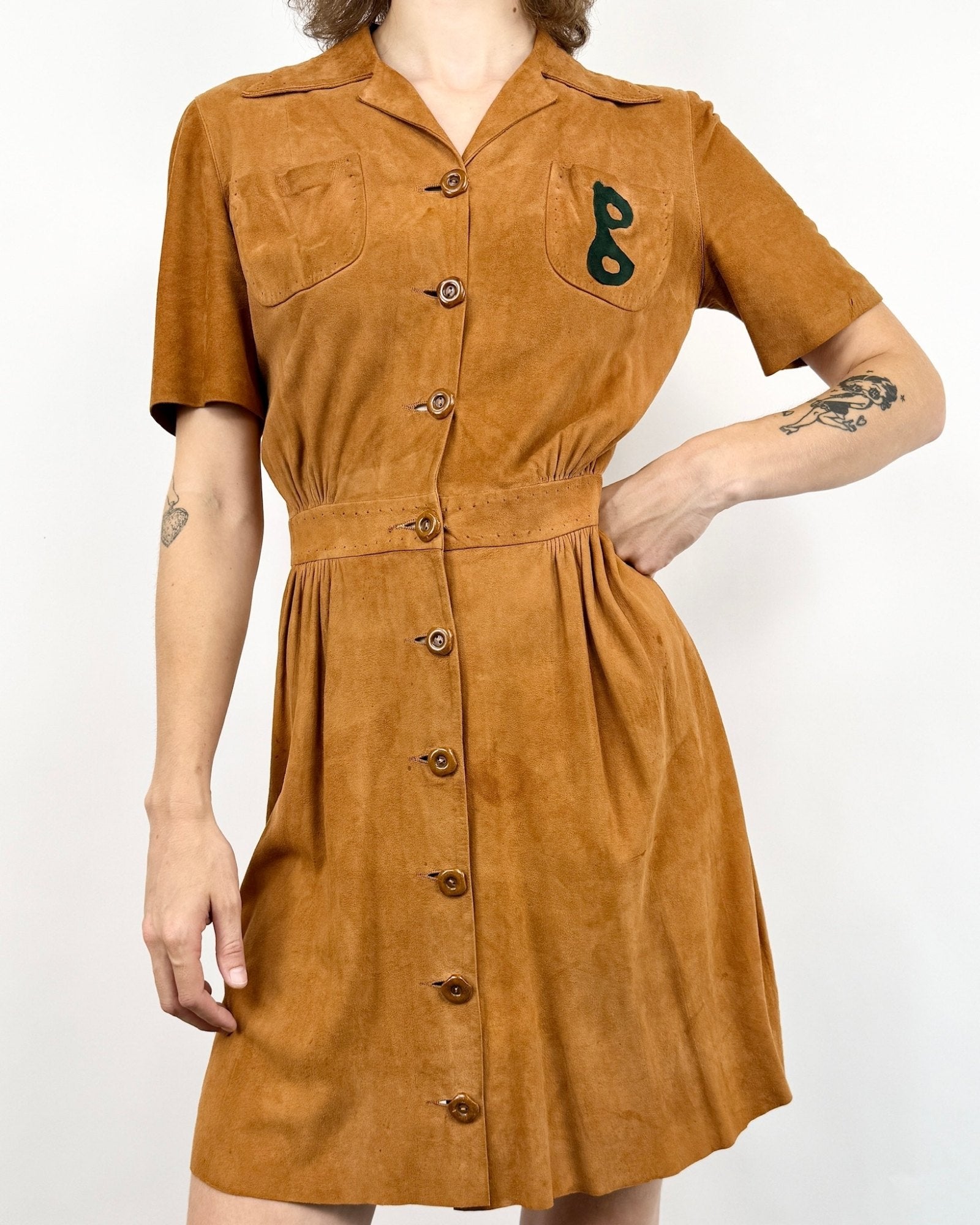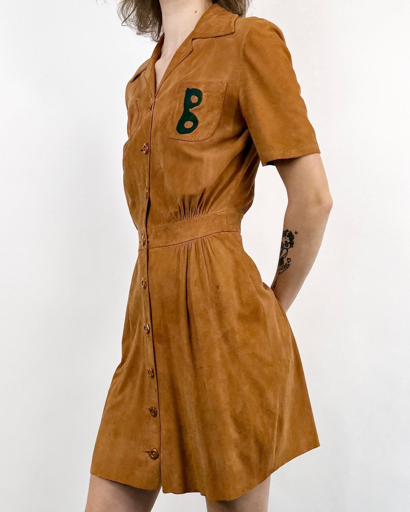 1940s suede sportswear dress detailed with hand stitched suede initial patch. Features a pointed collar and tailored waistband for an A-line fit.