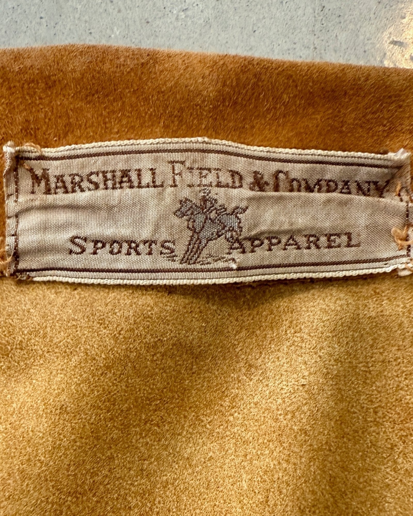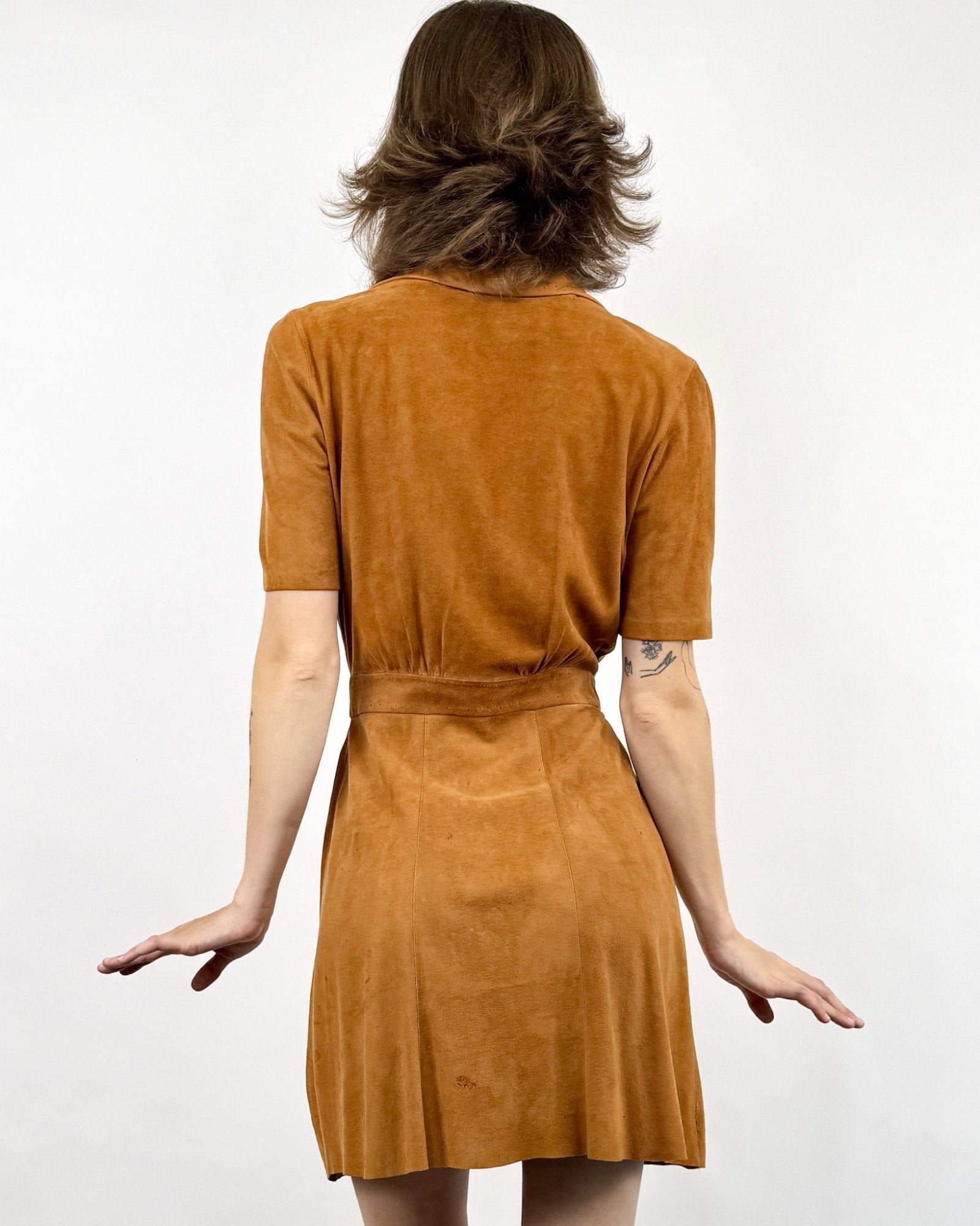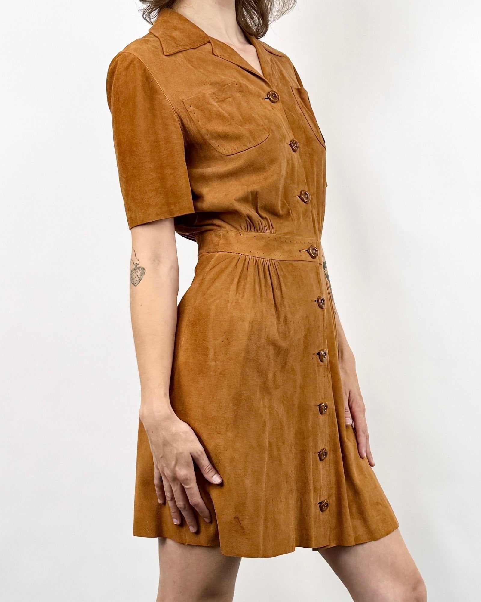 1940s suede sportswear dress detailed with hand stitched suede initial patch. Features a pointed collar and tailored waistband for an A-line fit.