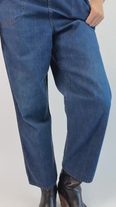 Indigo high waisted blue jeans with orange contrast stitching and side zip. Features a relaxed cut with subtle tapering.