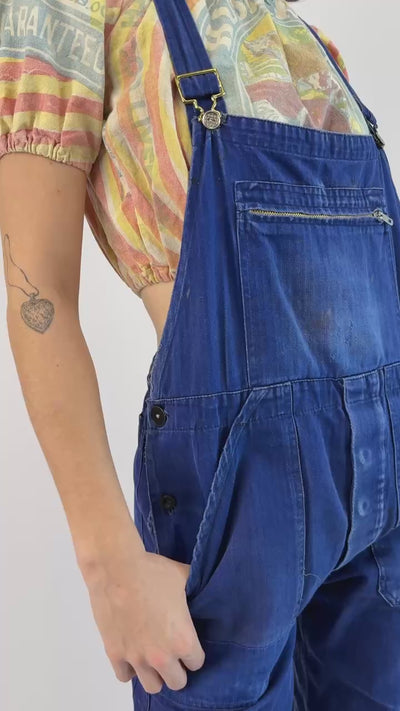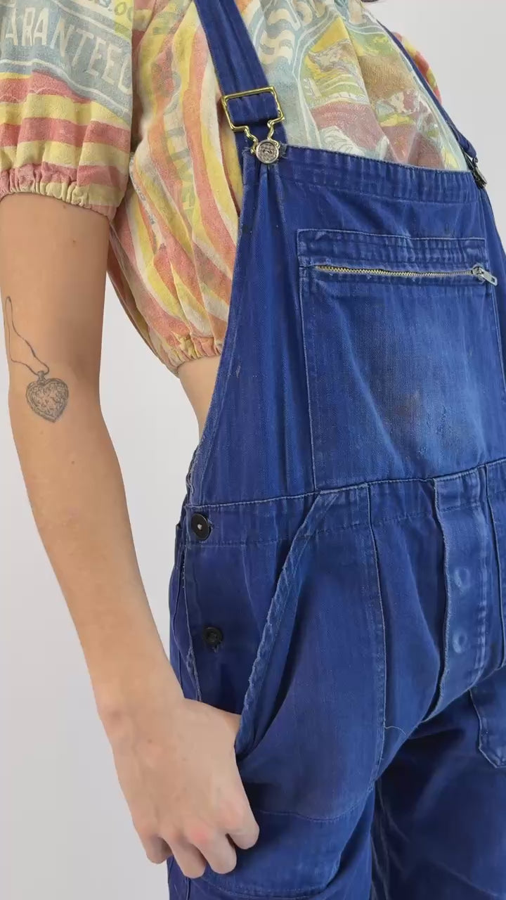 Deep indigo blue 1940s French workwear overalls featuring a straight leg cut, front zip pocket and side button closures.