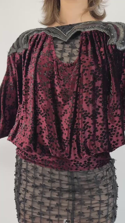 70s deep maroon velvet draped top with curved black leather and sequin accenting across the shoulders and neckline. Layer over a flirty LBD or style with some slinky leather trousers and pointed heels.