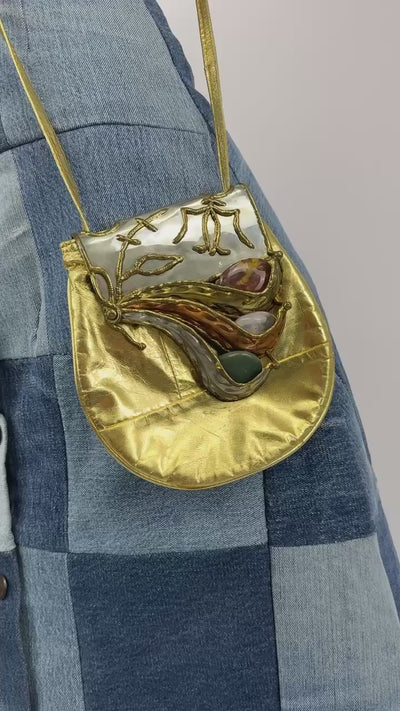 Glimmering gold crossbody bag with a silver cover detailed in bold crystals at the front. Perfectly fits a phone and other daily essentials in the main pouch, with an additional zip pocket on the back exterior.