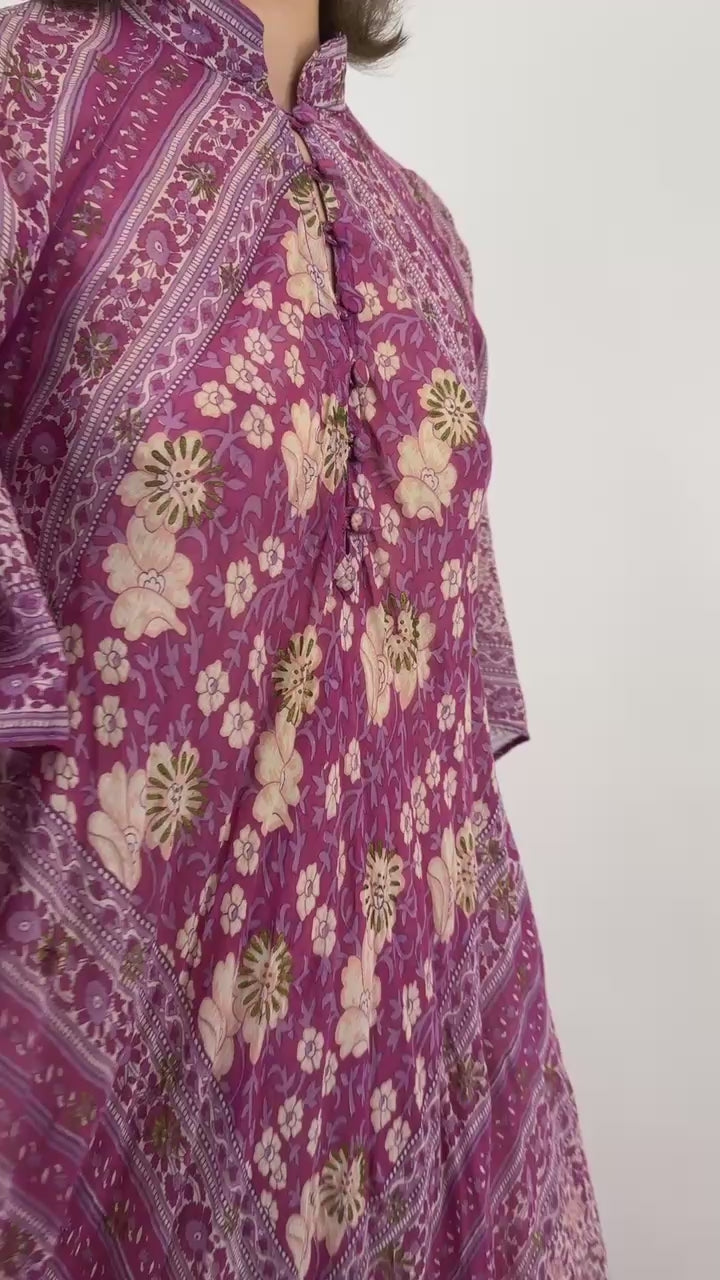Like a mirror to the Austin skyline as it wanes into sunset, this Adini rarity cascades in soft violet hues from its delicate buttoned neckline through handkerchief-cut sleeves, all the way to the floor, fluttering with every step.