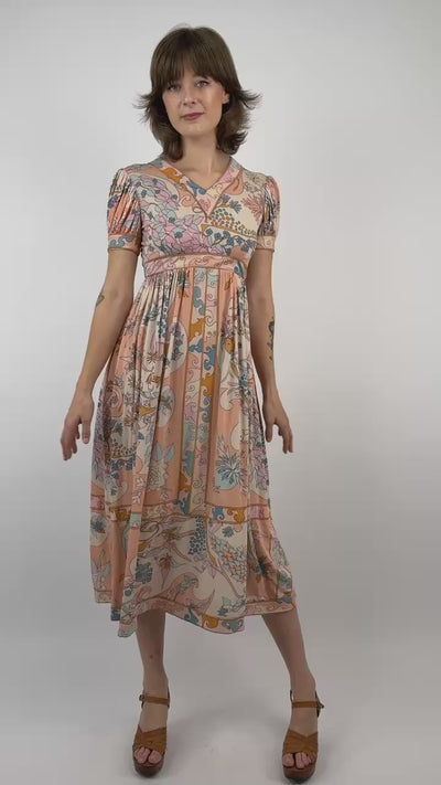 Light peach knee-length dress with high V-neckline and subtle puff sleeves. Features an empire waist and gathered skirt.