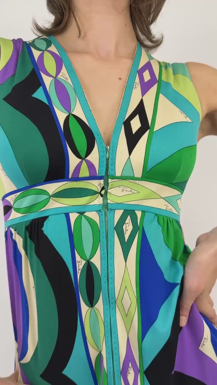 Teal multicolored psychedelic print Pucci tunic/mini dress. Features a V neckline and empire waist, style with tights and your favorite leather boots!