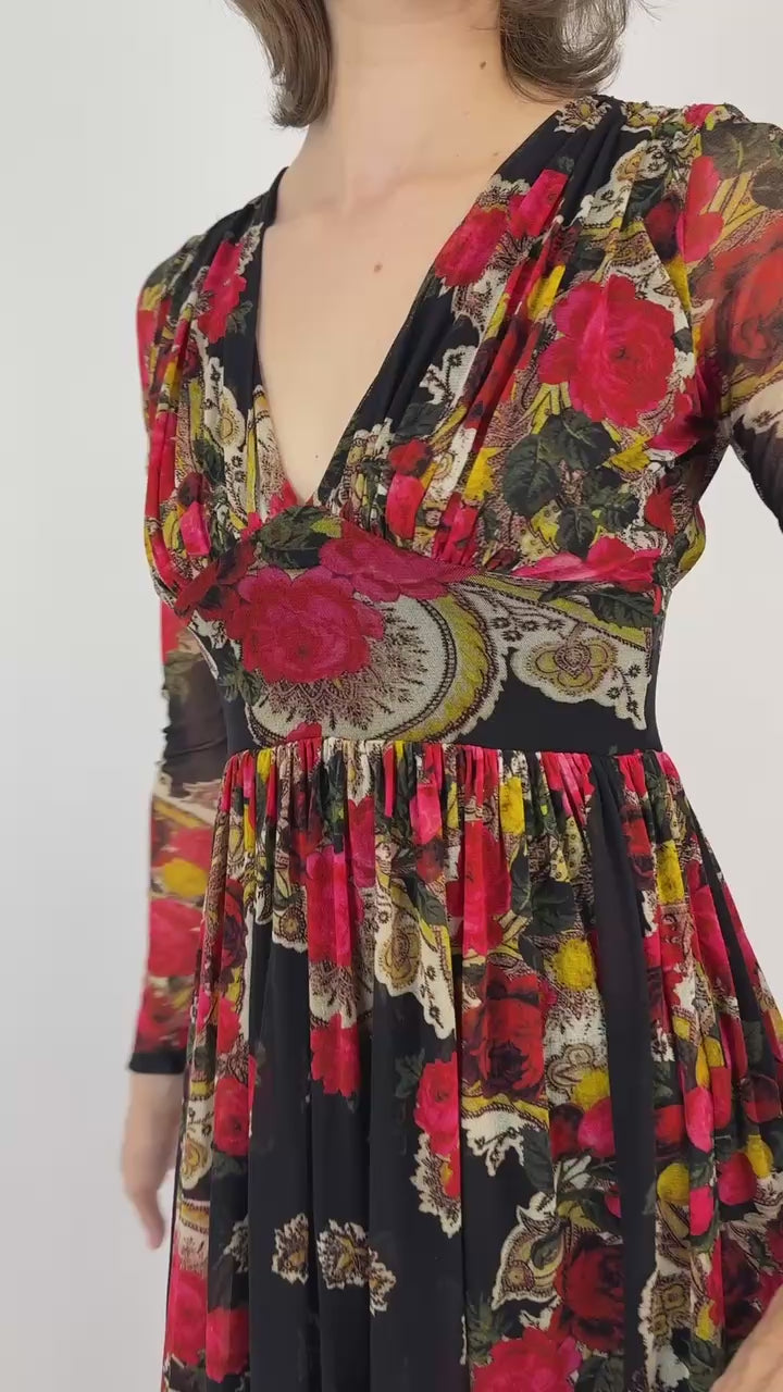 Black mesh long sleeve dress with romantic red florals blooming throughout. Features a deep V neckline and a gathered skirt.