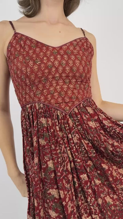 Maroon and rust hued Indian cotton sun dress with varying golden floral print at the bodice and skirt. Features a V neckline and a gathered skirt which creates beautiful swaying movement with every step!