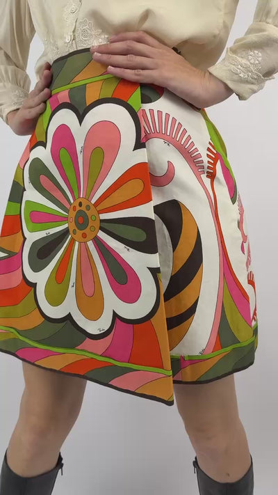 High waisted wrap-style mini skirt with vibrant multicolored groovy flower power graphic print throughout.