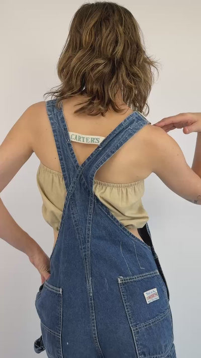 Deep blue denim overalls with multi-pocket bib and white straps with green Carter's script on the back. Style with a romantic puff sleeve blouse or a cotton crop top for warmer days!