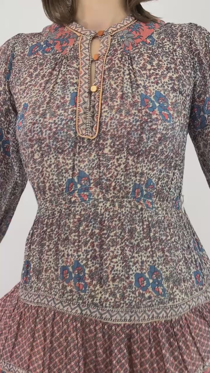 This romantic floral Casa Blanca sundress drifts across the air effortlessly, finished with a quarter-button neckline and an elastic shirred waist that adds both comfort and a touch of gentle structure. Perfect for layering during cozy cabin getaways or intimate dinner dates tucked inside a warm café.