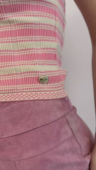 Baby pink and white striped knit tee by Chanel. Features a darling double C charm with accented with rhinestones at the hem and a check trim throughout.