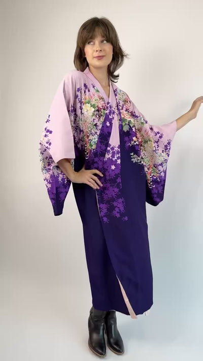Stunning reversible silk kimono duster robe, one side in dual-tone lavender and royal purple, the other side in pale blush pink, both featuring detailed floral prints.