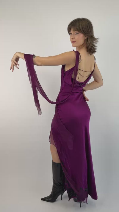Step into twilight elegance in this breathtaking deep plum silk gown, where ink-black beaded appliqués trace the neckline like delicate midnight vines. A daring side slit and a deep cowl-back adorned with cascading tiered beads add a whisper of drama and mesmerizing movement with every step.