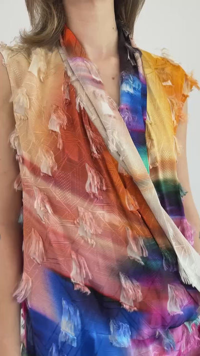 Bold multicolored sleeveless wrap dress. Features a subtle folded collar, watercolor print, and raw, feathered edges.