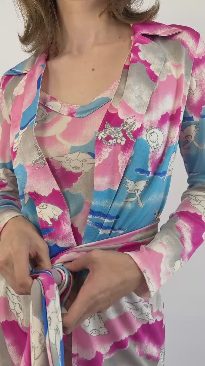 This Diane von Fürstenberg maxi dress and jacket set elevates the whimsy of cloud watching to new heights. Delicate pink and sky-blue clouds drift across the fabric, playfully dotted with hopping bunnies, creating an ensemble that feels as light and effortless as a gentle breeze.
