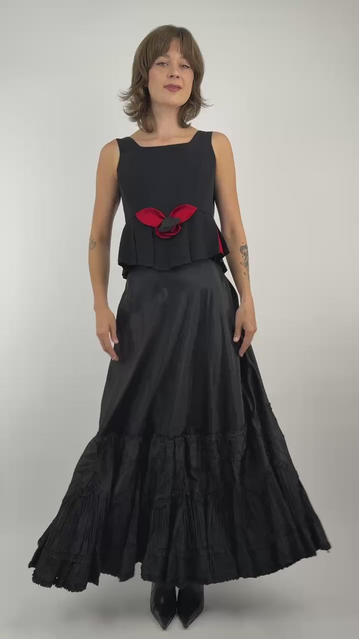 Gorgeous midnight black peplum top with scarlet red rosette and peekaboo pleating at the waist. Features a high square neckline and impeccable darting for a tailored fit.