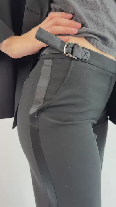 Classic black suit set with a twist. Features satin detailing at the lapels, pant seams and waist band with adjustable sides. Style with a sleek blouse underneath or your favorite vintage band tee.
