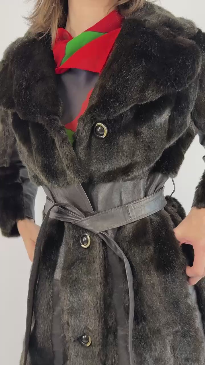Dark chocolate brown faux fur knee-length duster jacket with large black and gold buttons. Features side pockets and a faux leather belt.