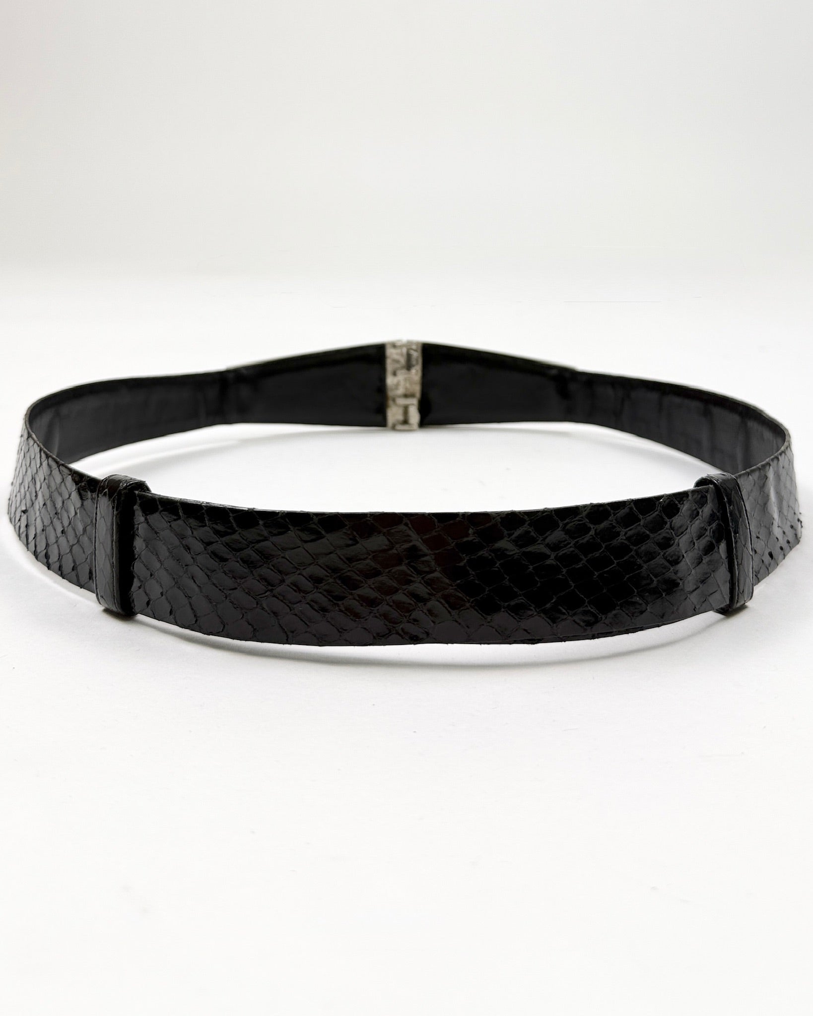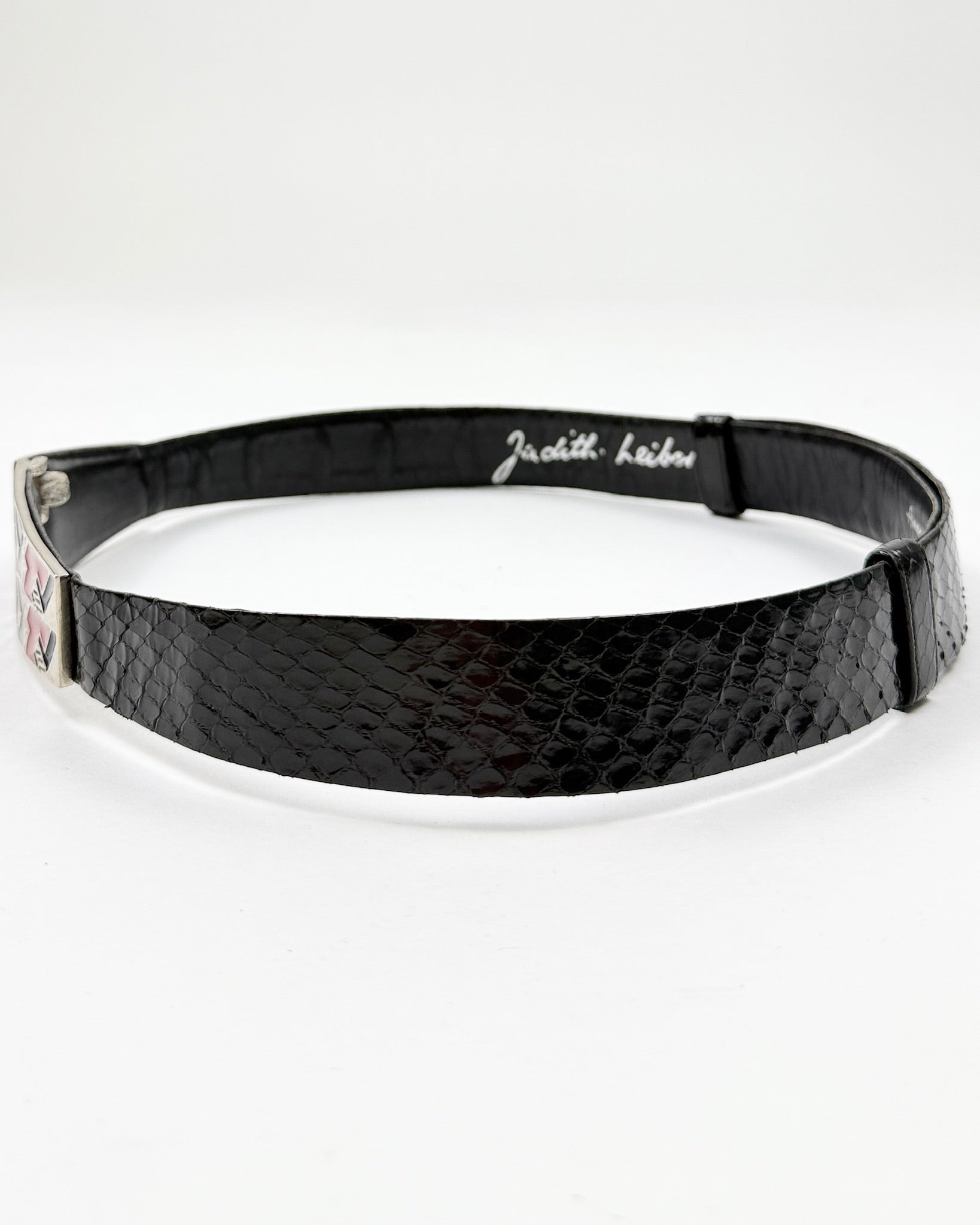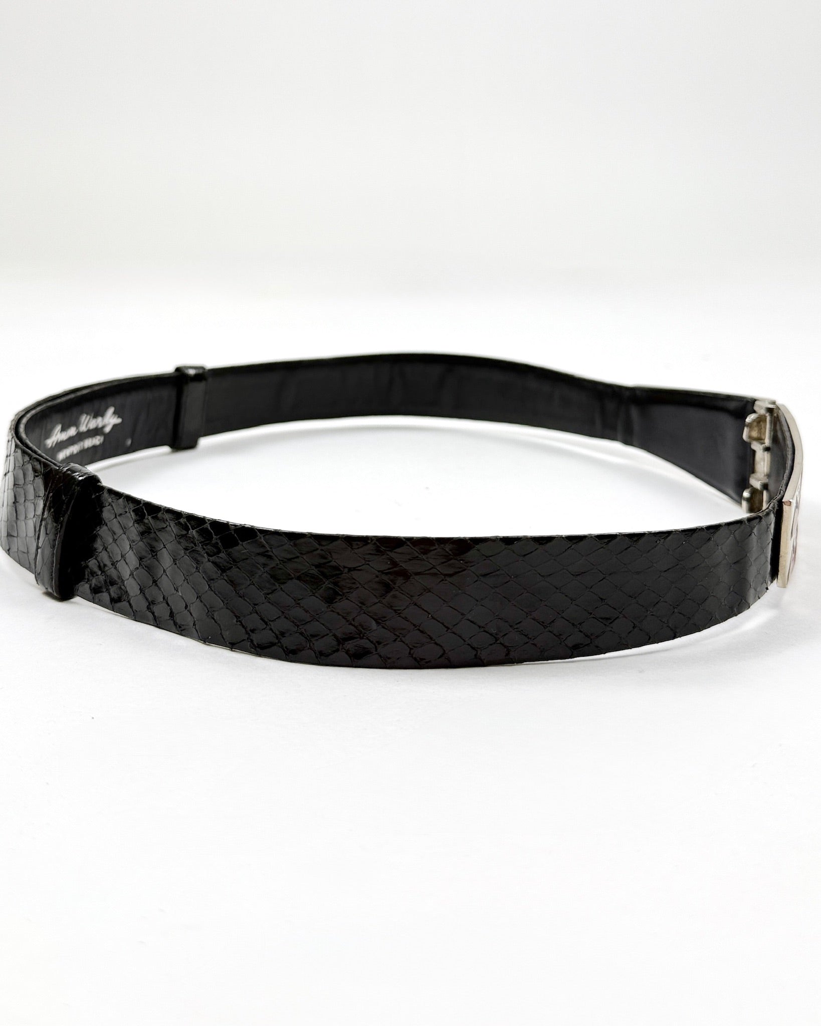 Black snakeskin belt with silver, red and black zigzag embellishment at the clasp. Can be worn on the waist or low on the hip.