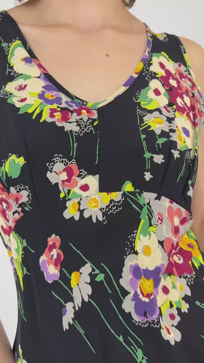 Darling black mini slip dress with dainty floral clusters printed throughout. Features a subtle V neckline and sweet key hole detail and buttons at the back.