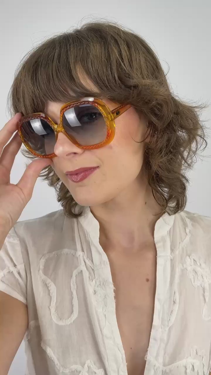 Round golden yellow frames with twist detail at the front and deep blue lenses.