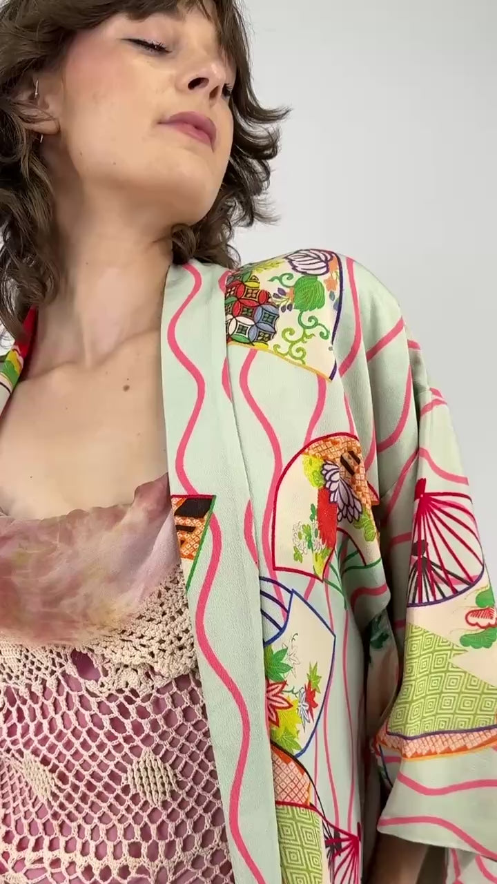 Flowing silk kimono with playful fan print throughout. Layer over a darling mini dress or over a cotton blouse and your favorite slouchy pair of denim.
