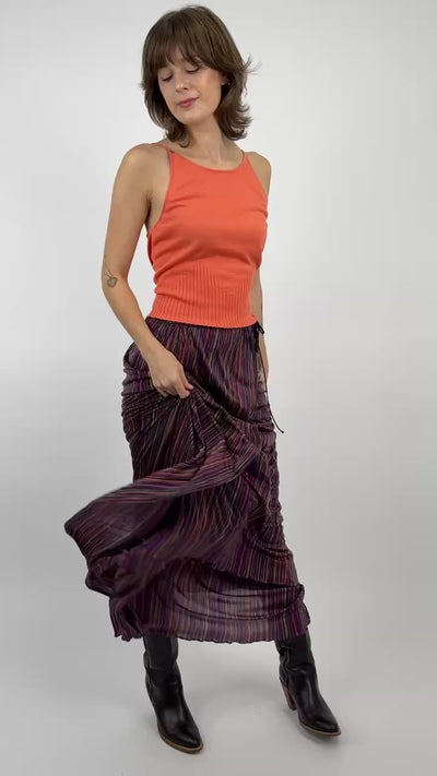 Layered silk maxi wrap skirt with thin vertical striped rainbow pattern throughout. Style as a sarong with a swimsuit on holiday or with a minimal cotton blouse. Still had the original tags attached!