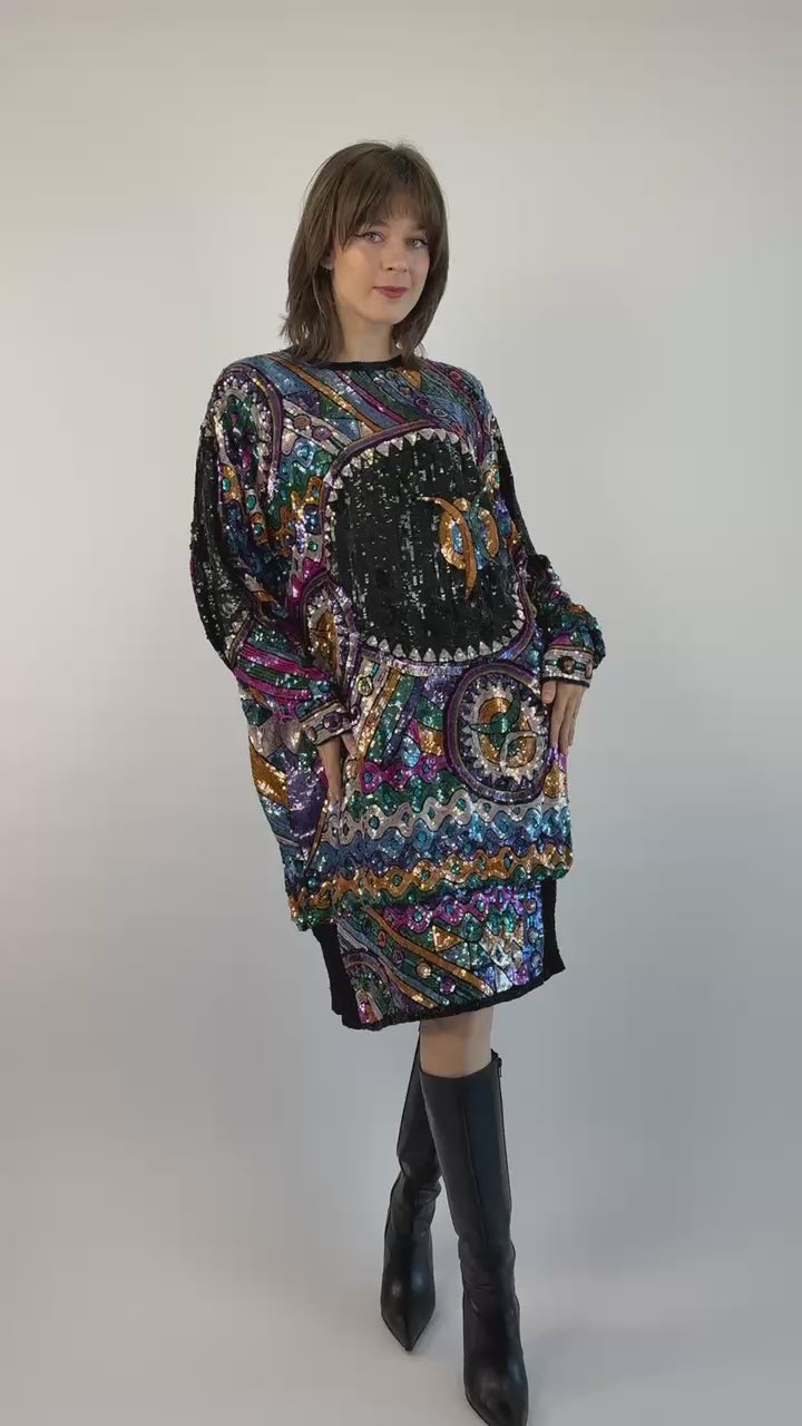 Bring the party wherever you go in this slouchy and sparkling sequin draped dress, featuring a dazzling variety of geometric and swirling designs throughout.