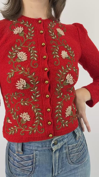 Holly red classic cardigan with gold and ivory floral beading throughout the front. Features subtle gathering at the shoulders and gleaming gold buttons.