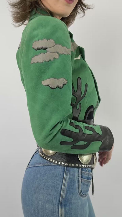 Inspired by the mystic vibes of the Southwest, this Jean Claude Jitrois suede jacket unfolds like a wearable landscape, stitched with leather desert motifs that drift from front to back. The absolute best quality leather and amazing fit. When found this jacket had a tag on it marked $3600!