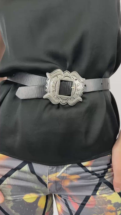 Classic black leather waist belt with silver concho belt buckle and tri-square concho detailing at the back.