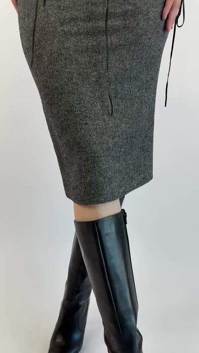 Classic black and white figure-hugging tweed pencil skirt. Features a high waist cut and a pleat at the back.