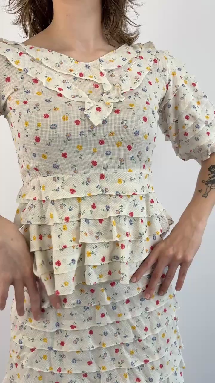Absolutely darling white cotton voile day dress with rows and rows of dainty ruffles from waist to hem featuring a ditsy floral print and charming V neckline.