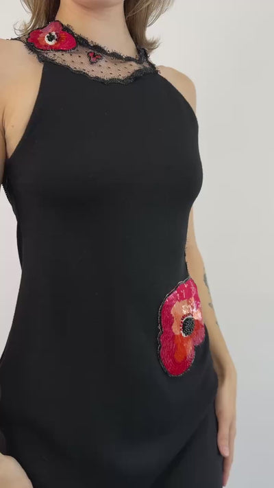 Midnight black cocktail dress featuring Swiss dot mesh paneling at the neckline and waist, decorated with artful hot pink sequin flower appliqués that reflect light with a dazzling sheen.