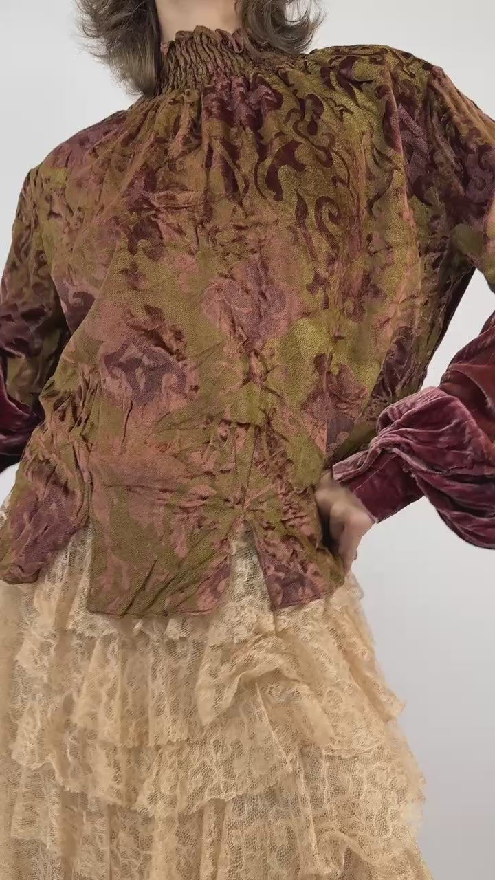 A beautiful design of rich texture and a softness, this burgundy and bronze velvet blouse features a shirred high neckline, billowing sleeves, and golden print making it an ideal piece for ethereal layering or styling simply with your favorite pair of Levi's and broken in Frye boots.