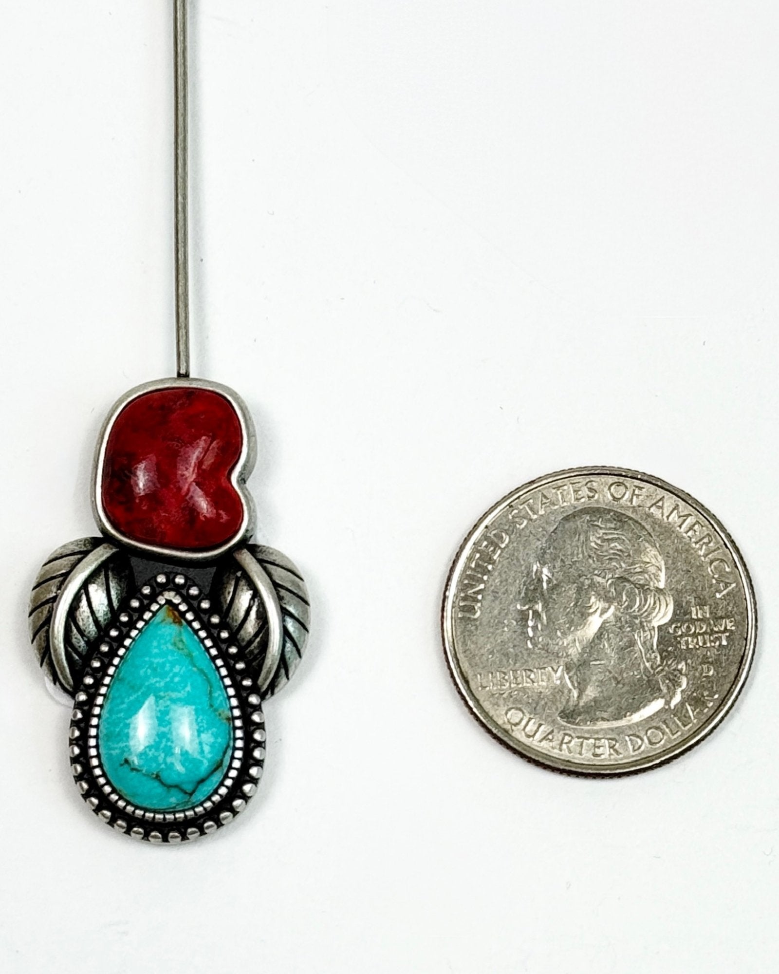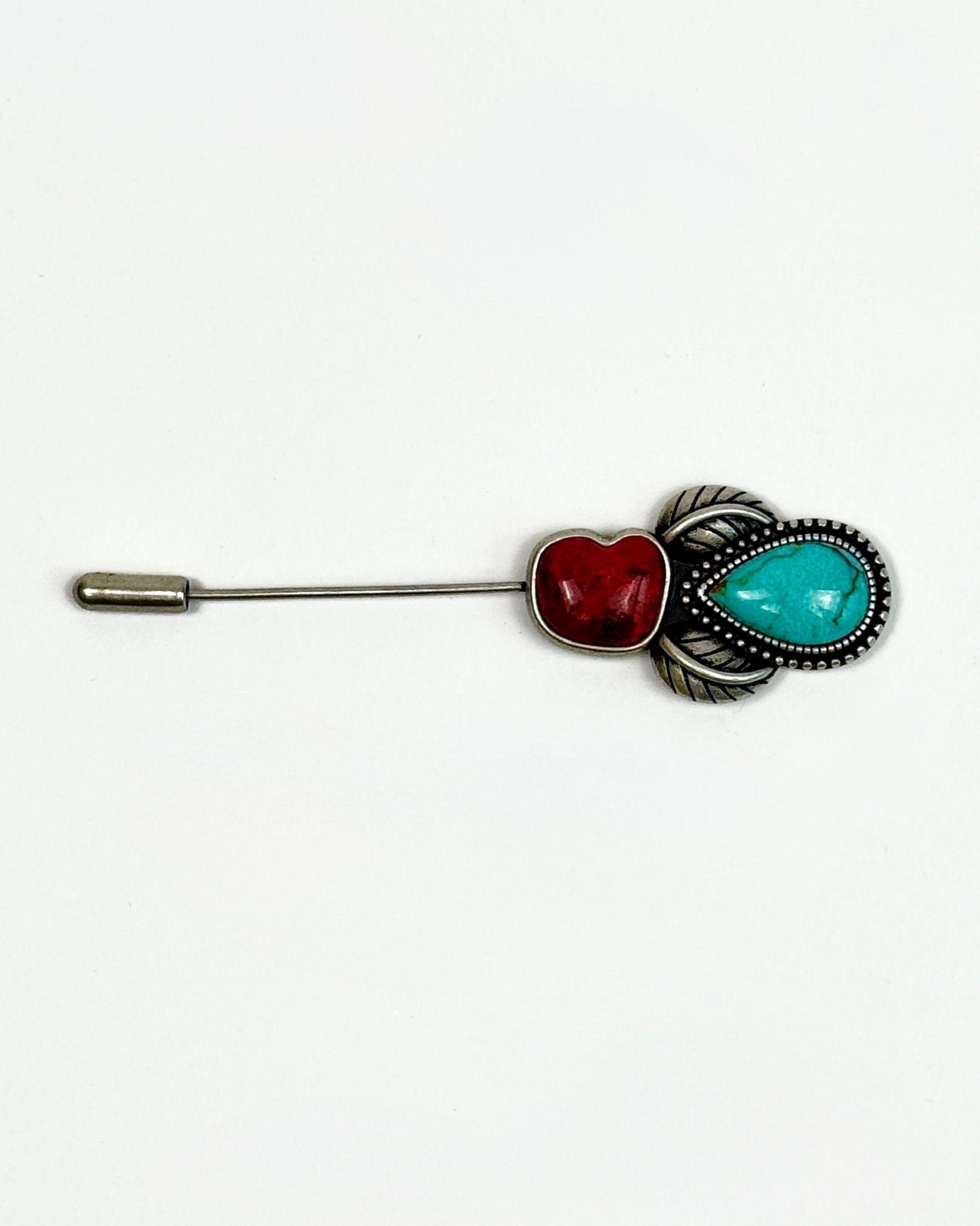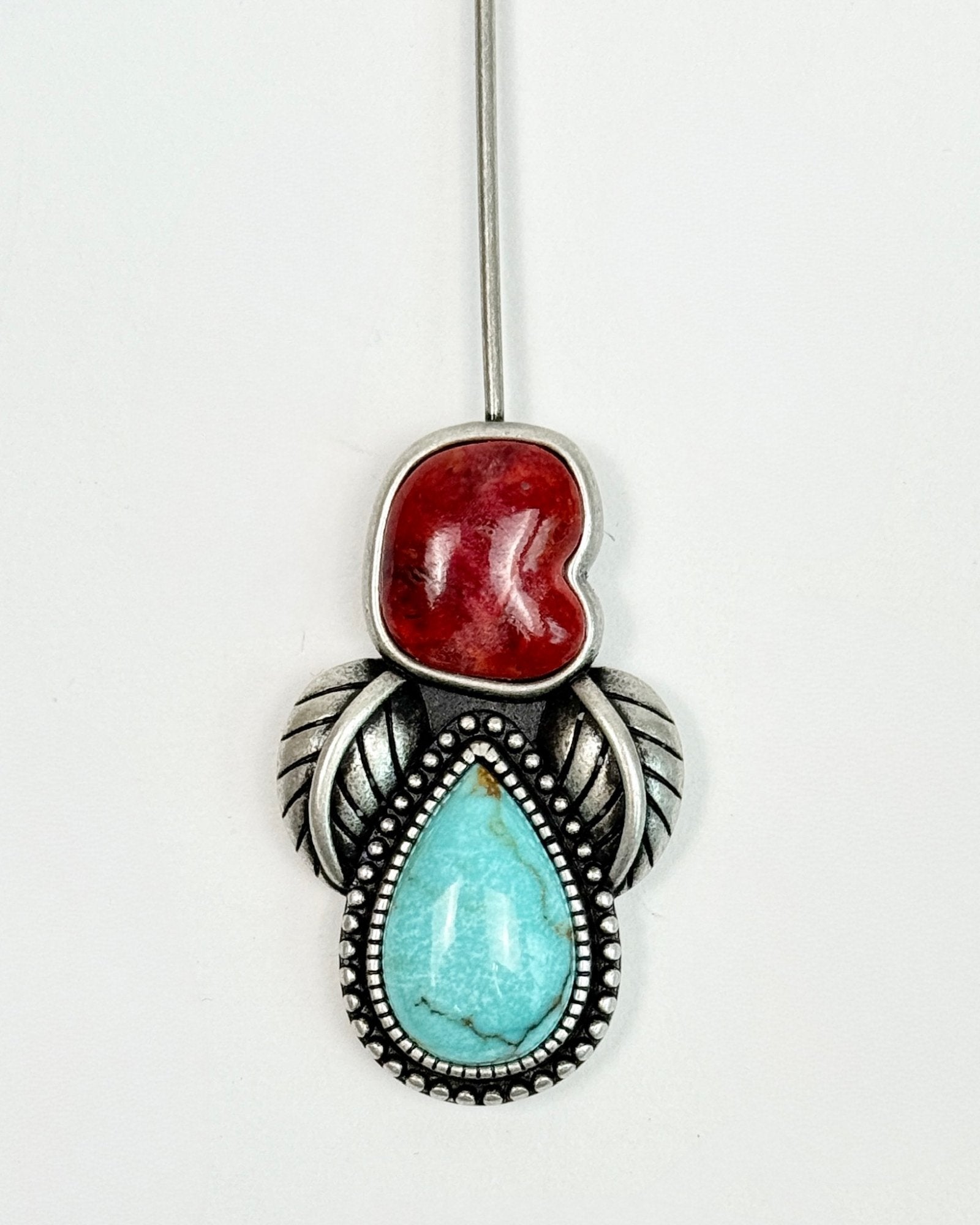 Traditional Southwest style Hat Pin with vibrant turquoise and rich oxblood coral stones. Each stone is securely set in a silver bezel, surrounded by half round beading and detailed silver leaves. The pin is oxidized, which gives a rustic patina that enhances the fine craftsmanship and highlights the intricate details.