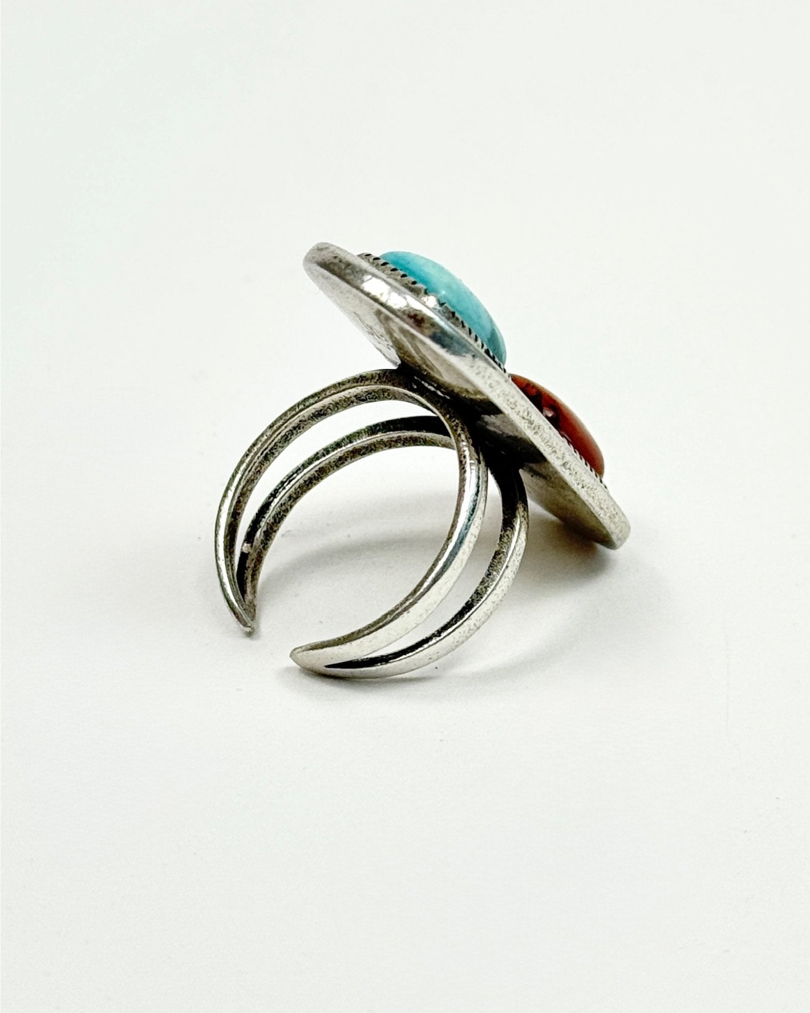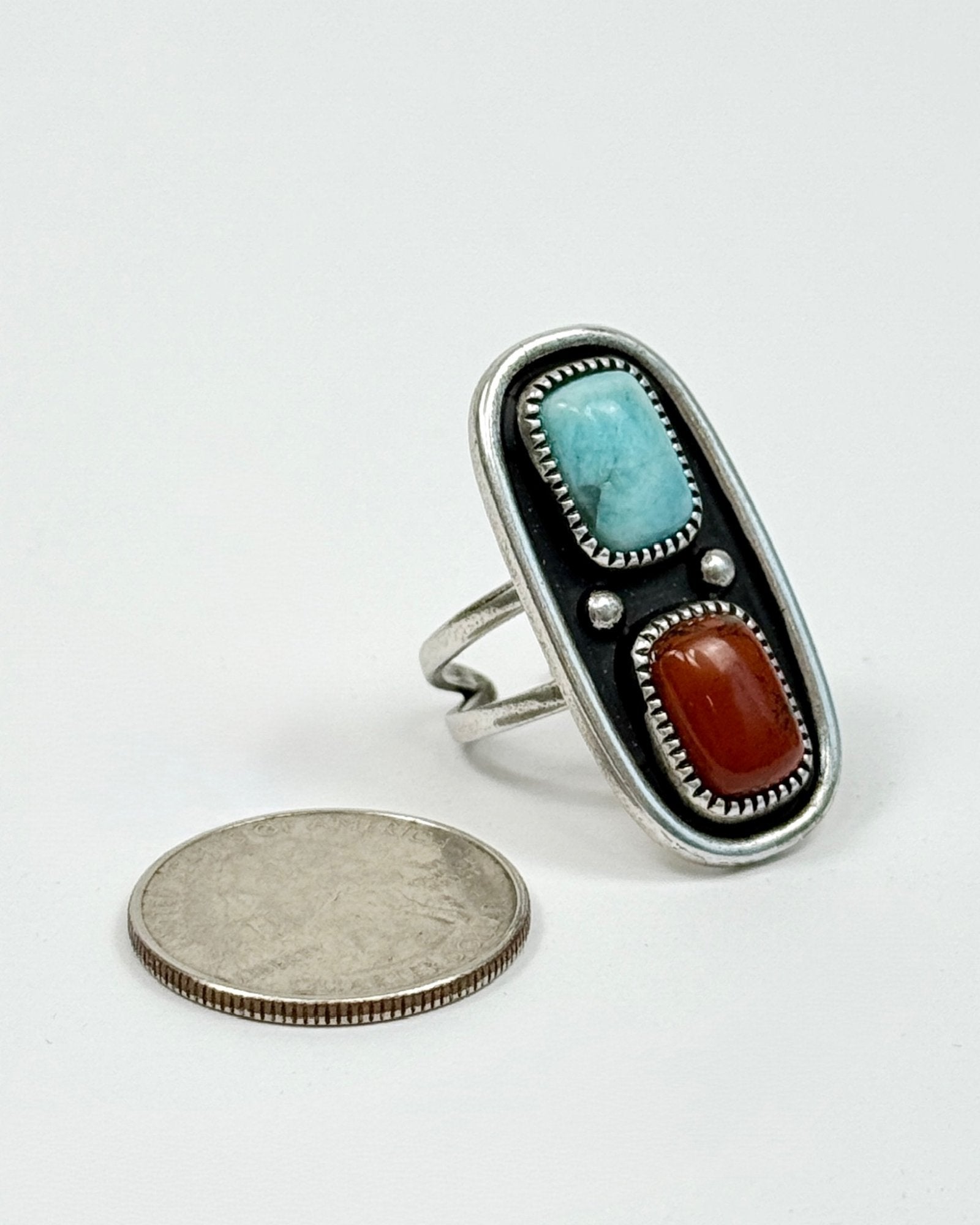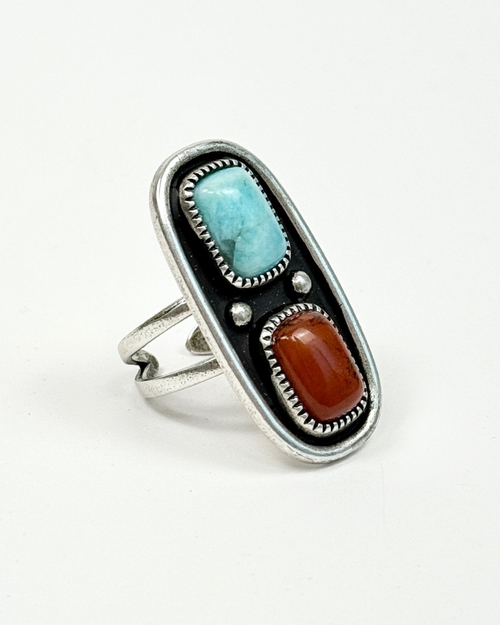 Traditional Southwest style Turquoise and Red Creek Jasper Ring. The stones are meticulously set within a silver bezel which is burnished for the utmost durability and finally hand oxidized to impart a rustic patina, making all the details pop! The dual-band design not only ensures comfort but also accommodates a wide range of finger sizes.