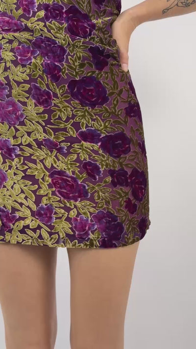 Alluring burnout velvet mini dress featuring a lustrous green and violet floral print throughout. Includes an attached slip lining.
