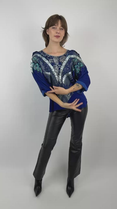 Royal blue knit blouse with bold peacock plume leather appliqués throughout. Features a wide neckline and semi cuffed sleeves.