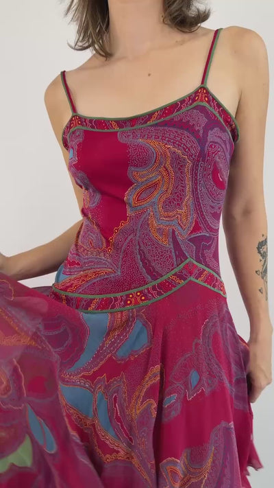 Romantic bias cut silk dress with rich berry tones in a swirl and dot print throughout. Features a delicate square neckline, subtle drop waist, and fluttering skirt.