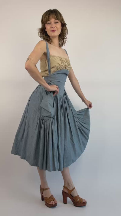 The urge to swish and sway has never been stronger! Flowing basque waist Norma Kamali chambray pinafore skirt featuring two deep side pockets and criss cross straps in the back.
