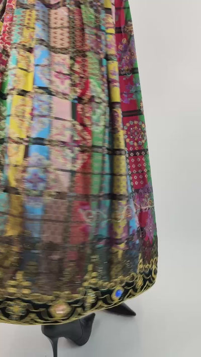 This Oscar de la Renta ensemble gleams in vibrant jewel tones, each golden thread catching the light as rows of floating beads dance down the blouse. Paired with its matching high-waisted skirt, the set glows with playful opulence.
