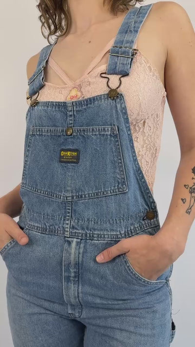 Medium wash Osh Kosh denim overalls featuring a classic pocket bib and tailored fit perfect for daily styling!