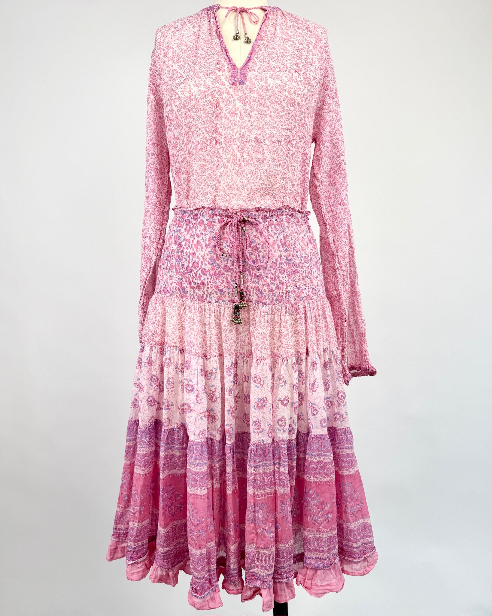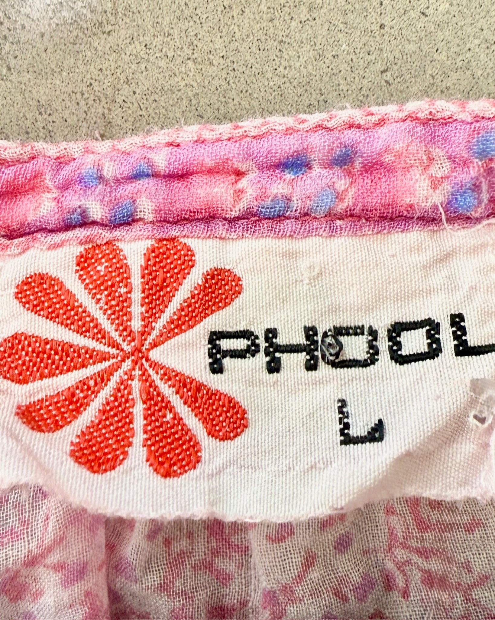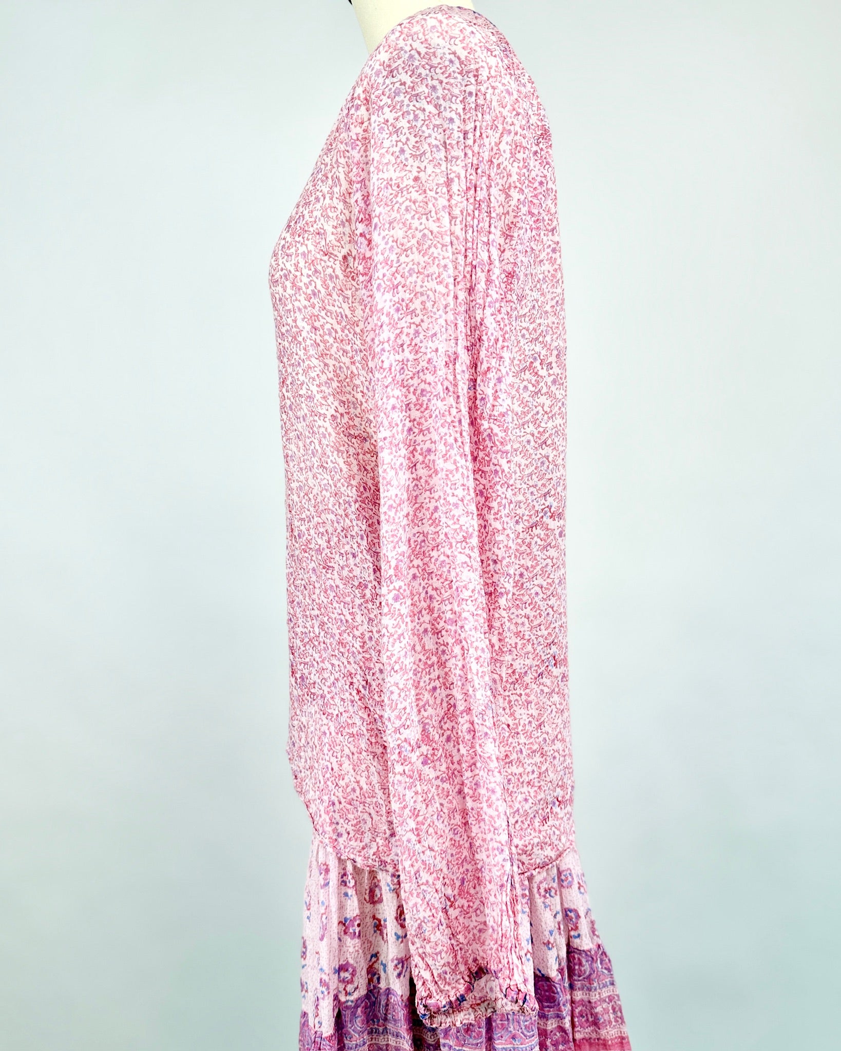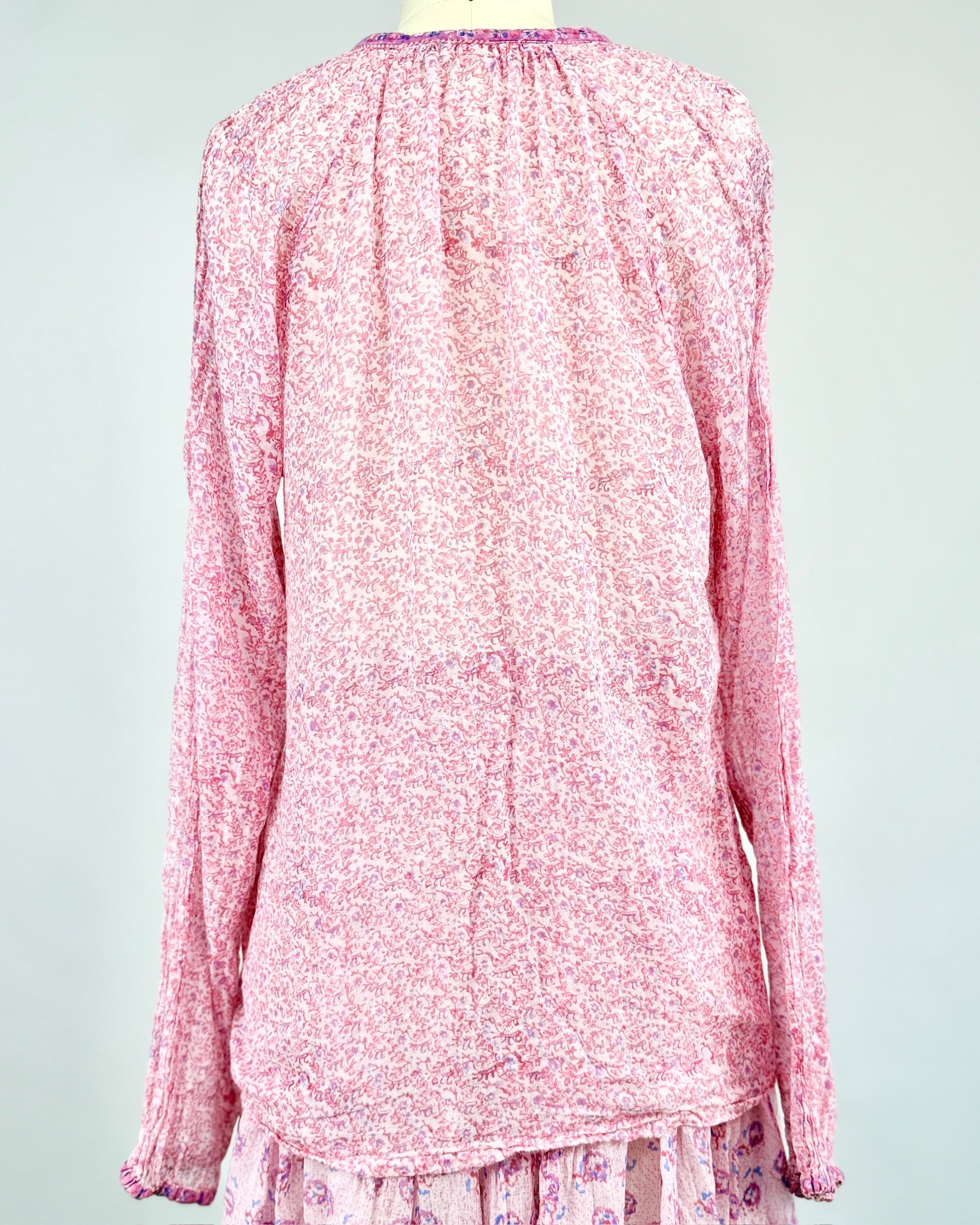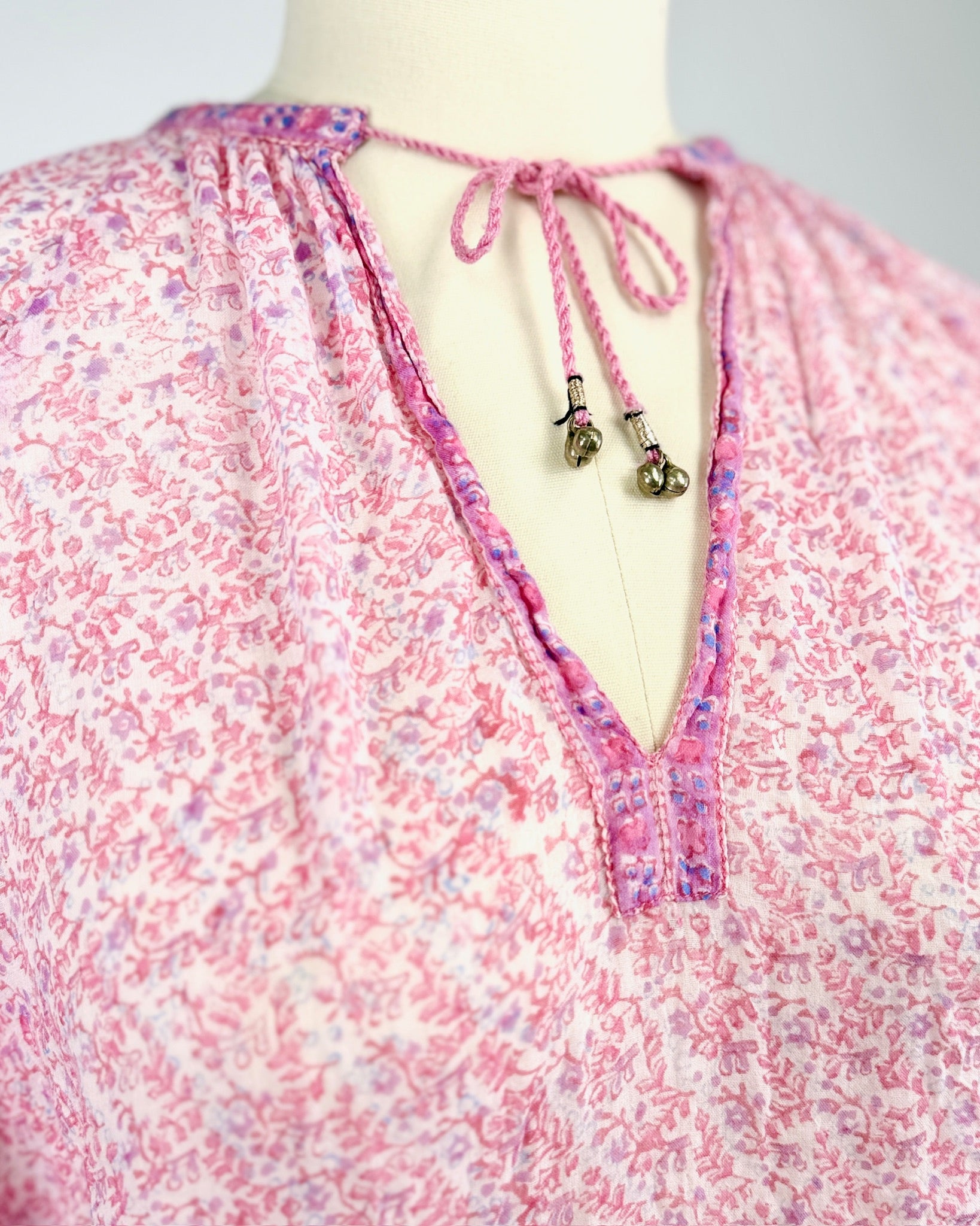 Cheery semi-sheer pink cotton blouse with dainty floral pattern throughout. Features a corded tie neckline with darling bells at the ends.