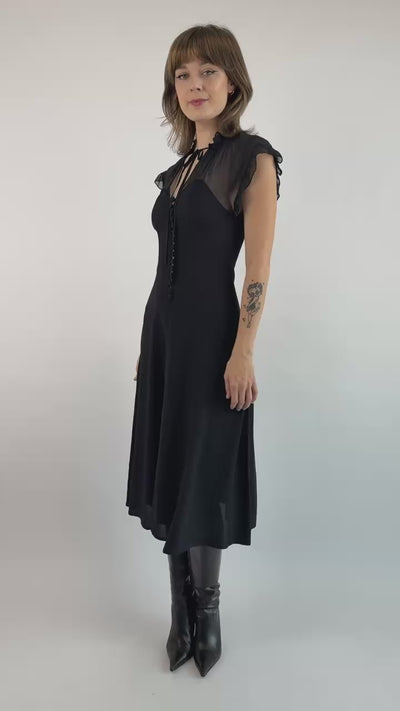 A bewitching bias-cut number to embody a deeply dark and romantic mood, this Radley of London midi dress features a darling sweetheart neckline framed in a chiffon underlay, literally all tied up with a bow.