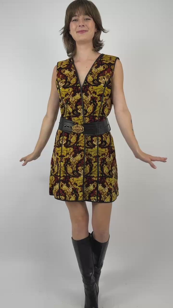 Maroon and gold velvet longline vest with black leather piping throughout. Features a V neckline and includes a wide black leather belt with golden buckle and pyramid studs.