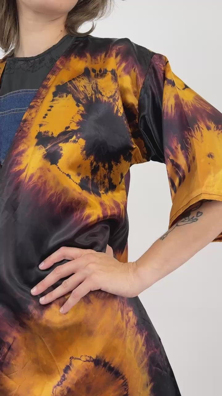 Luminous black satin knee-length robe with amber gold tie dye print throughout. Features short sleeves and an open front for easy layering.
