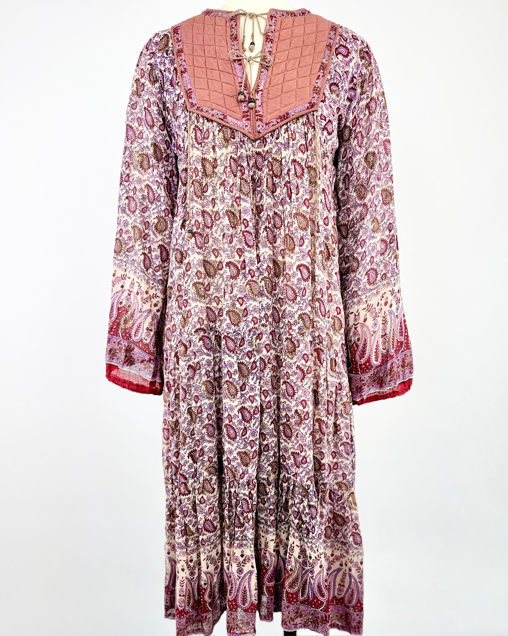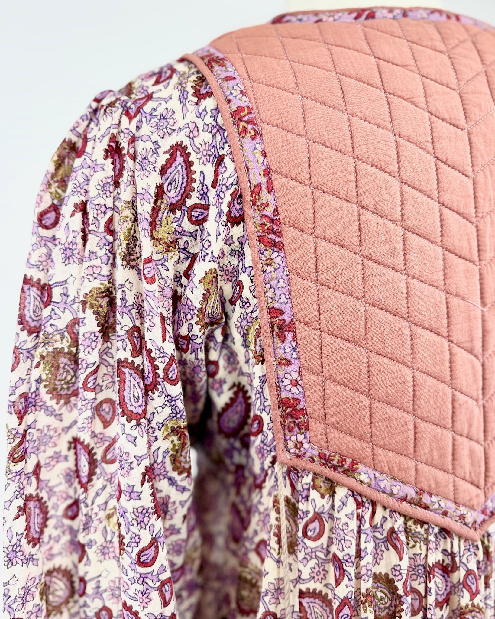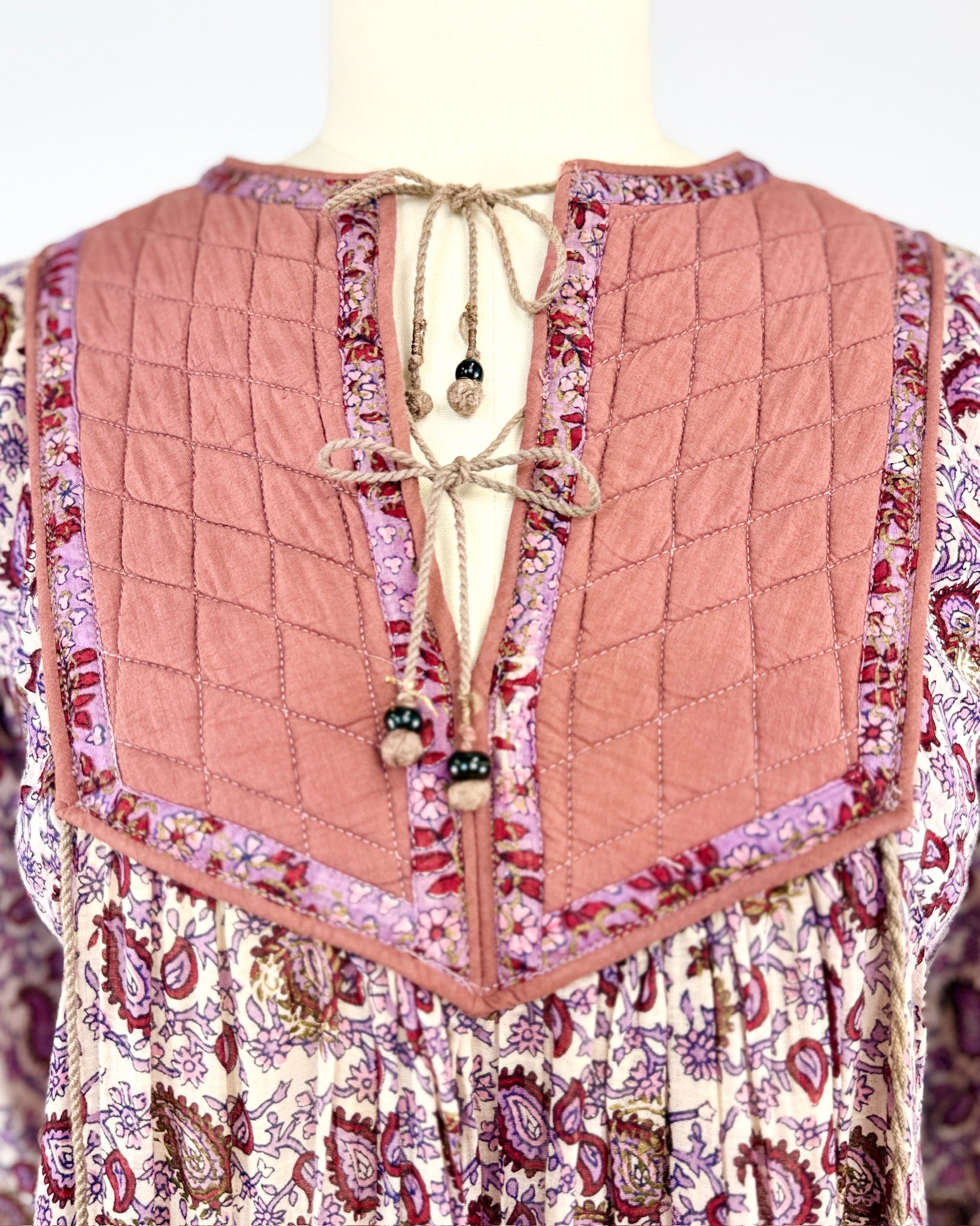 Beautiful gauzy sundress with purple floral print and contrasting quilted bib in a terracotta tone. Features double tie neckline and a flowing silhouette.